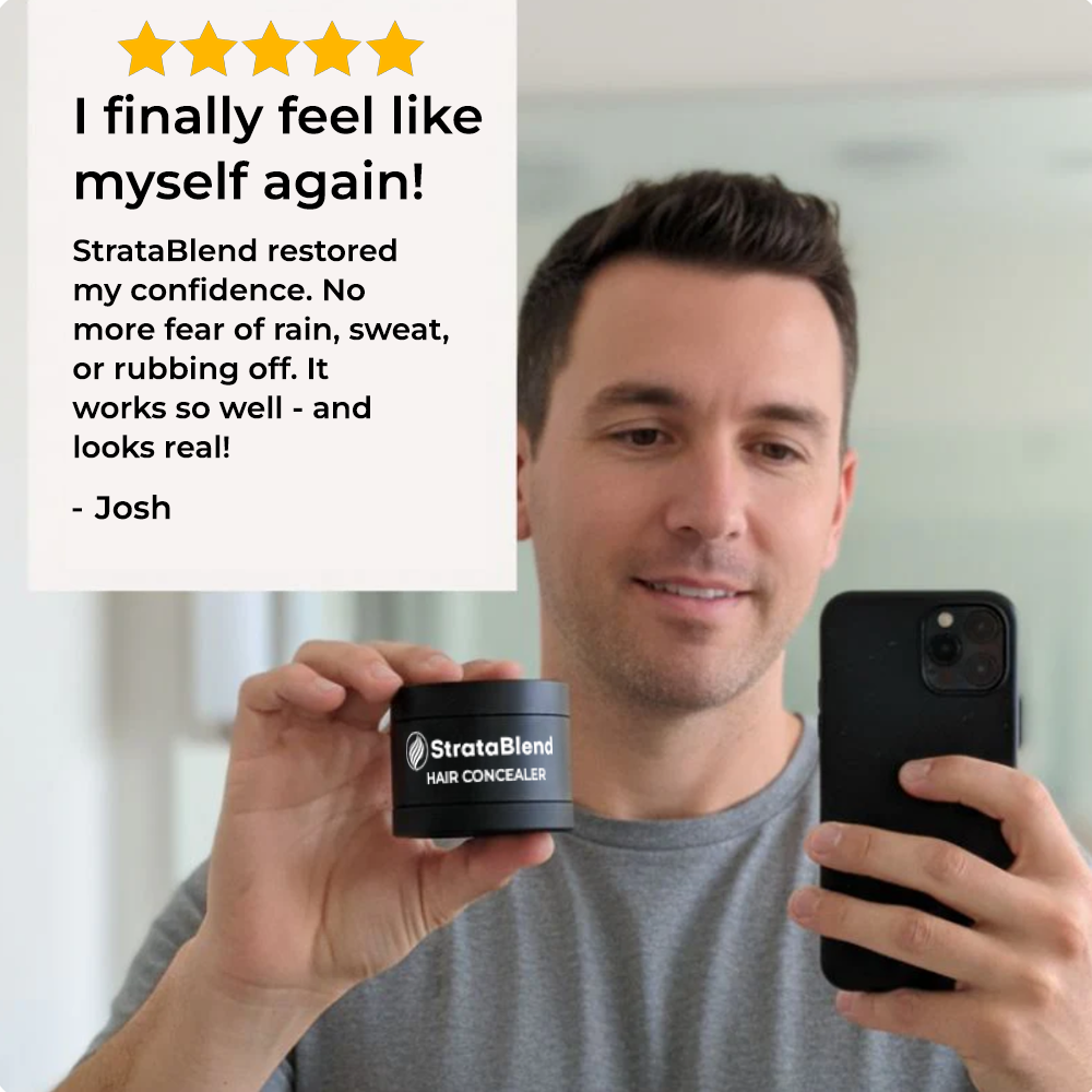 StrataBlendlend is made with cosmetic-grade mineral pigments (such as iron oxides for natural color), adhesion minerals that help the powder grip to both hair and skin, and light-conditioning agents for smooth, comfortable wear. It’s dye-free, fragrance-free, ammonia-free, and paraben-free — so it won’t damage your hair or scalp.